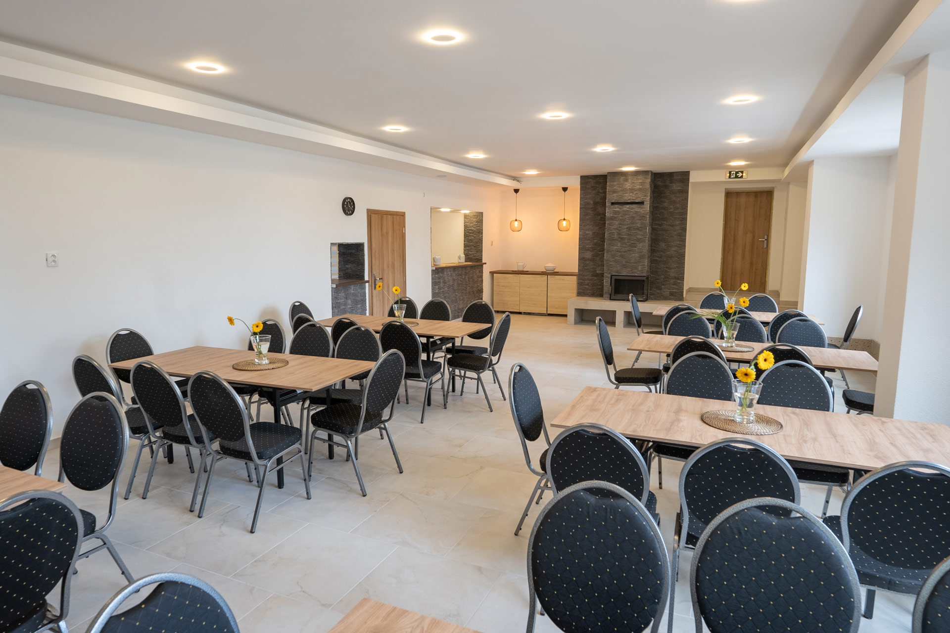 Každá izba je vybavená novým nábytkom vrátane postelí a vlastnou kúpeľňou so sprchovacím kútom a toaletou. Príjemná spoločenská miestnosť slúži na podávanie stravy, ale pokojne ju môžete využiť aj na rôzne aktivity a cvičenia. Veľký pozemok dáva priestor na hry, šport i oddych. Nechýba ohnisko s vonkajším posedením, vonkajšia terasa a pekné detské ihrisko s hojdačkami, preliezkami a pieskoviskom. Rekreačné stredisko disponuje vlastným parkoviskom s dostatočným počtom miest.